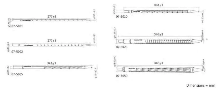 ● Ascending and descending graduations, Filter at the top of each pipette prevents damage to pipettors